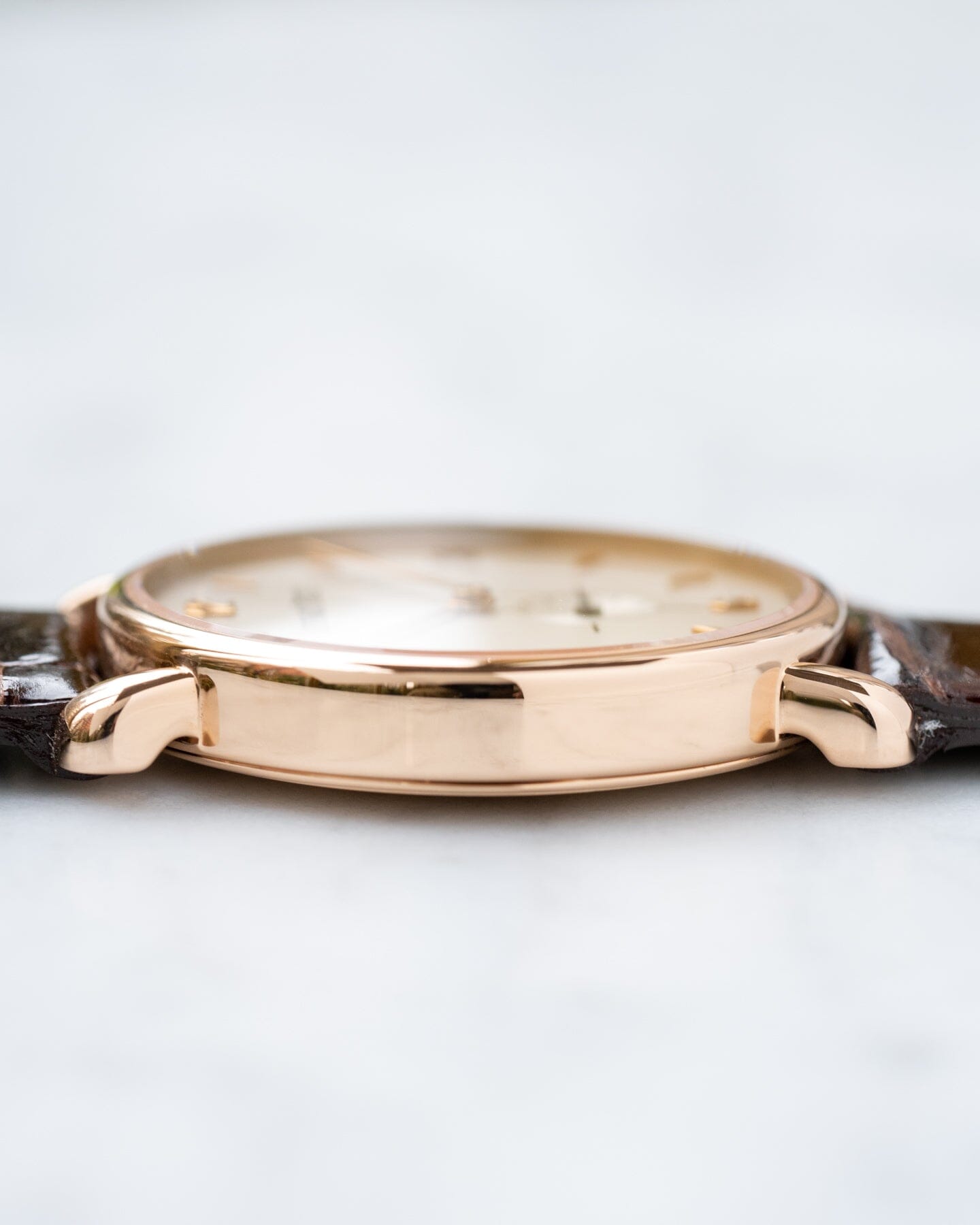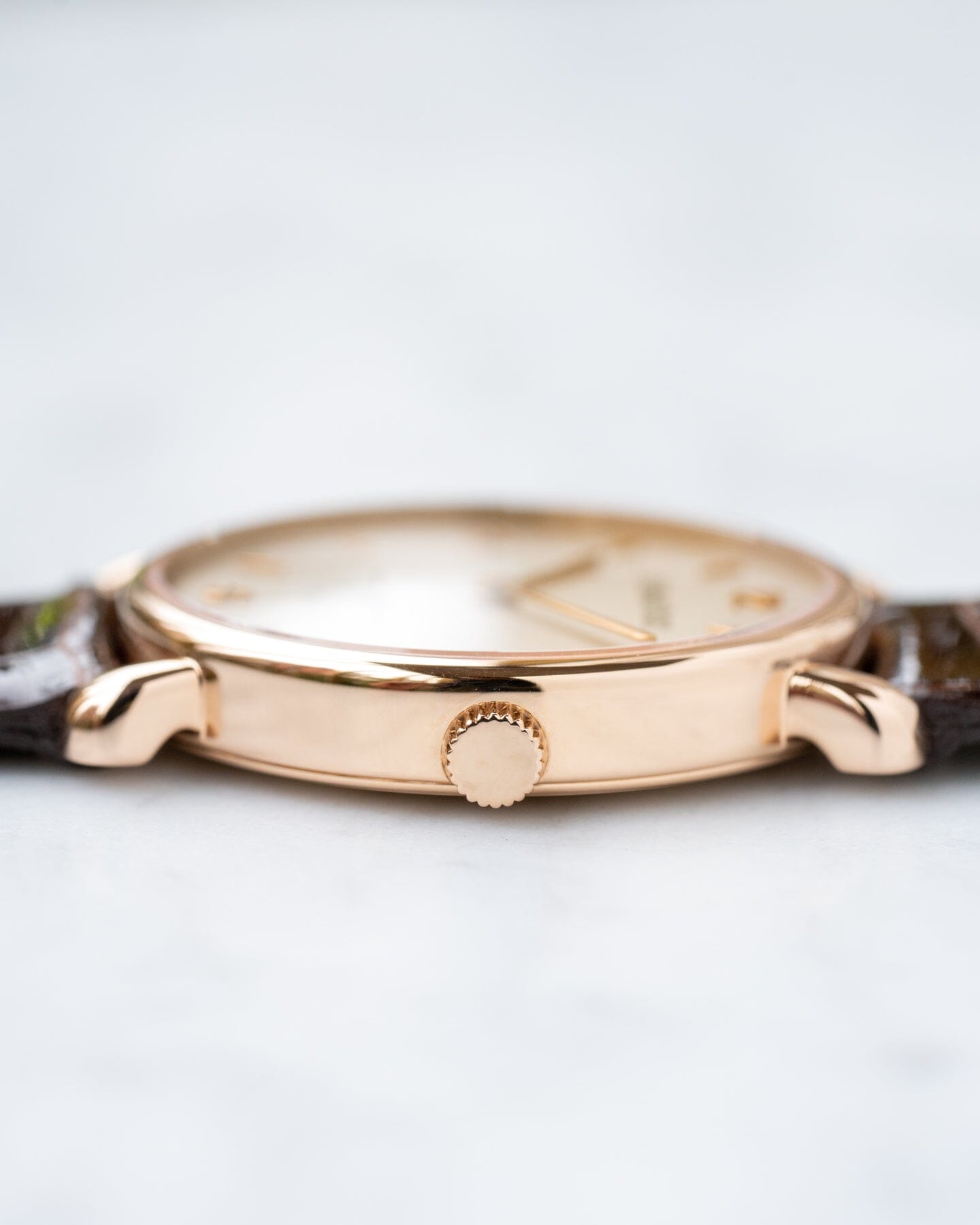 The case material is 18K pink gold. It has a warmer hue than yellow gold.