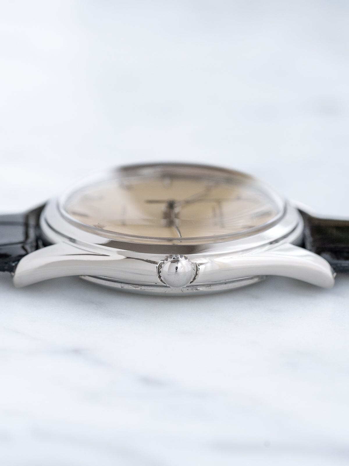 The case back is screw back, which is very rare, and has a concentric hairline finish and a polished outer circumference.