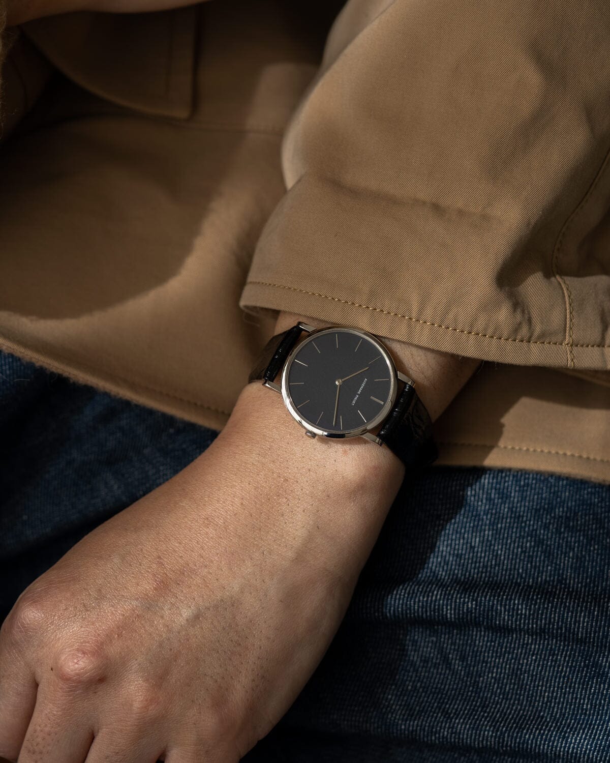 The case size is 35mm, which is rather large for a dress watch of the time, but with the black dial, you don't really feel the size of the watch.