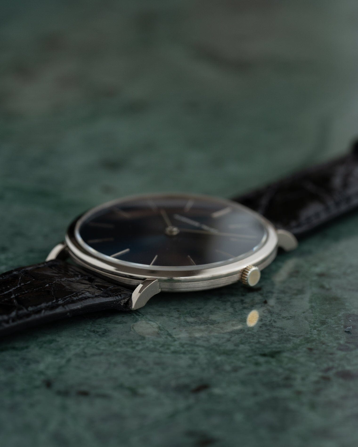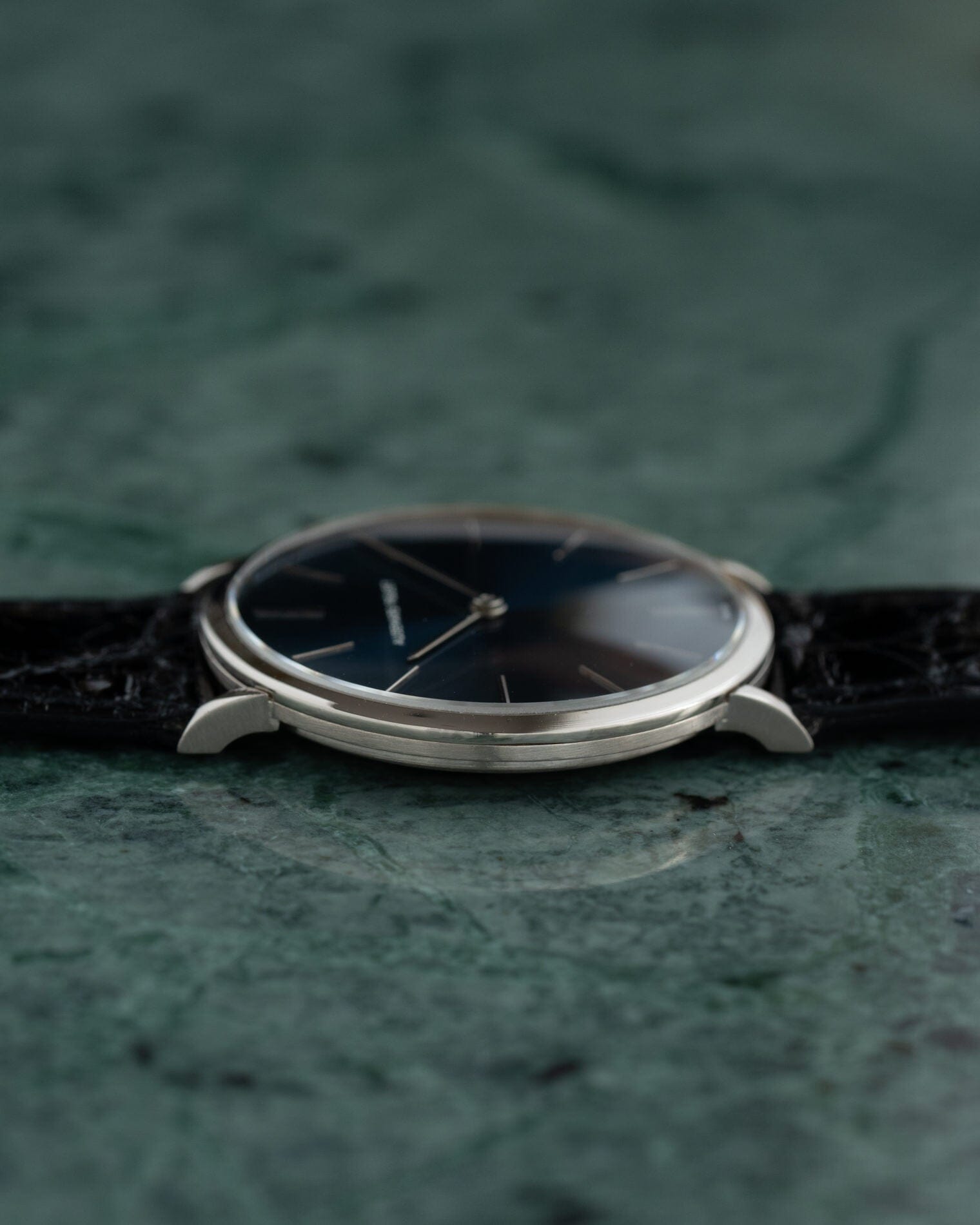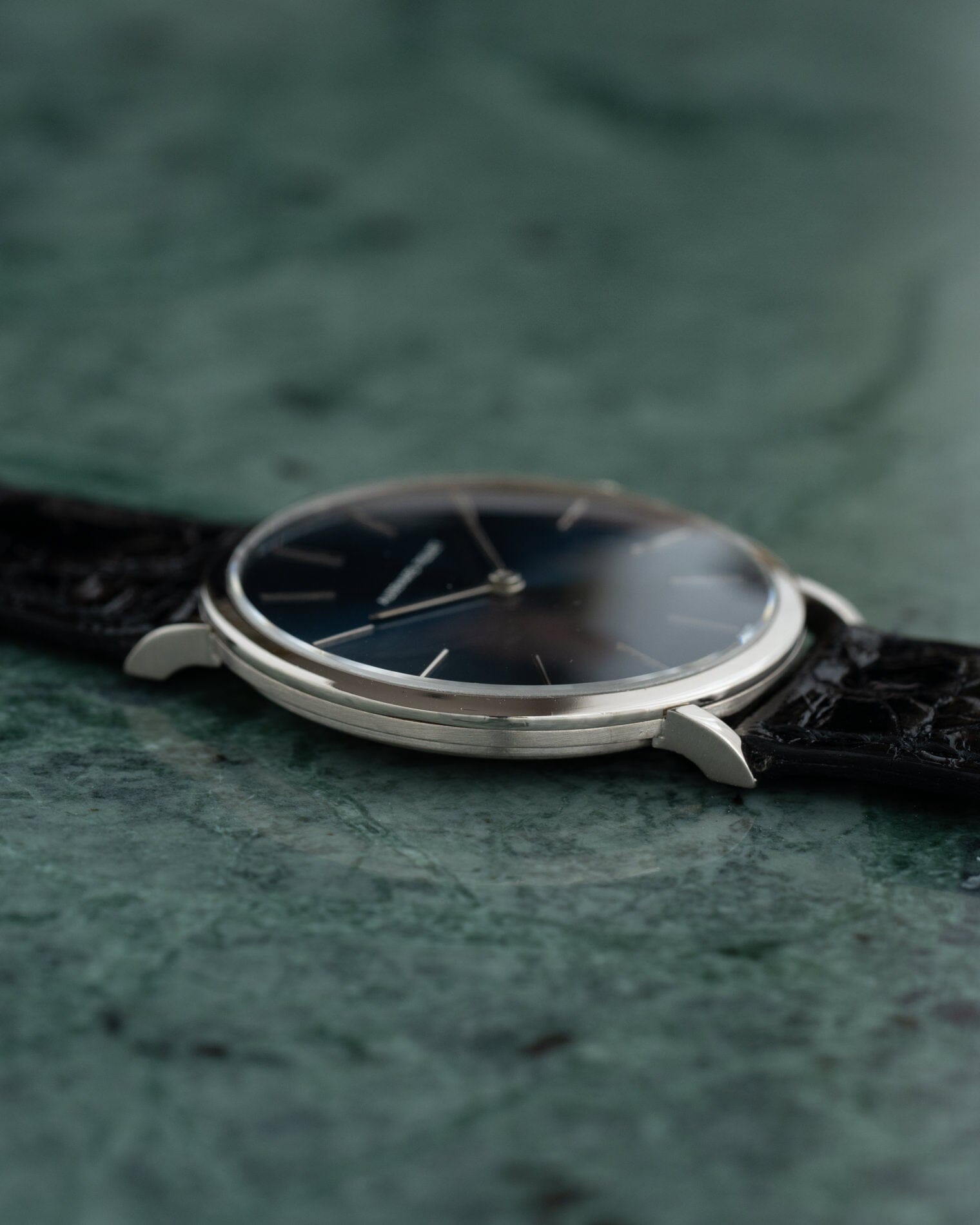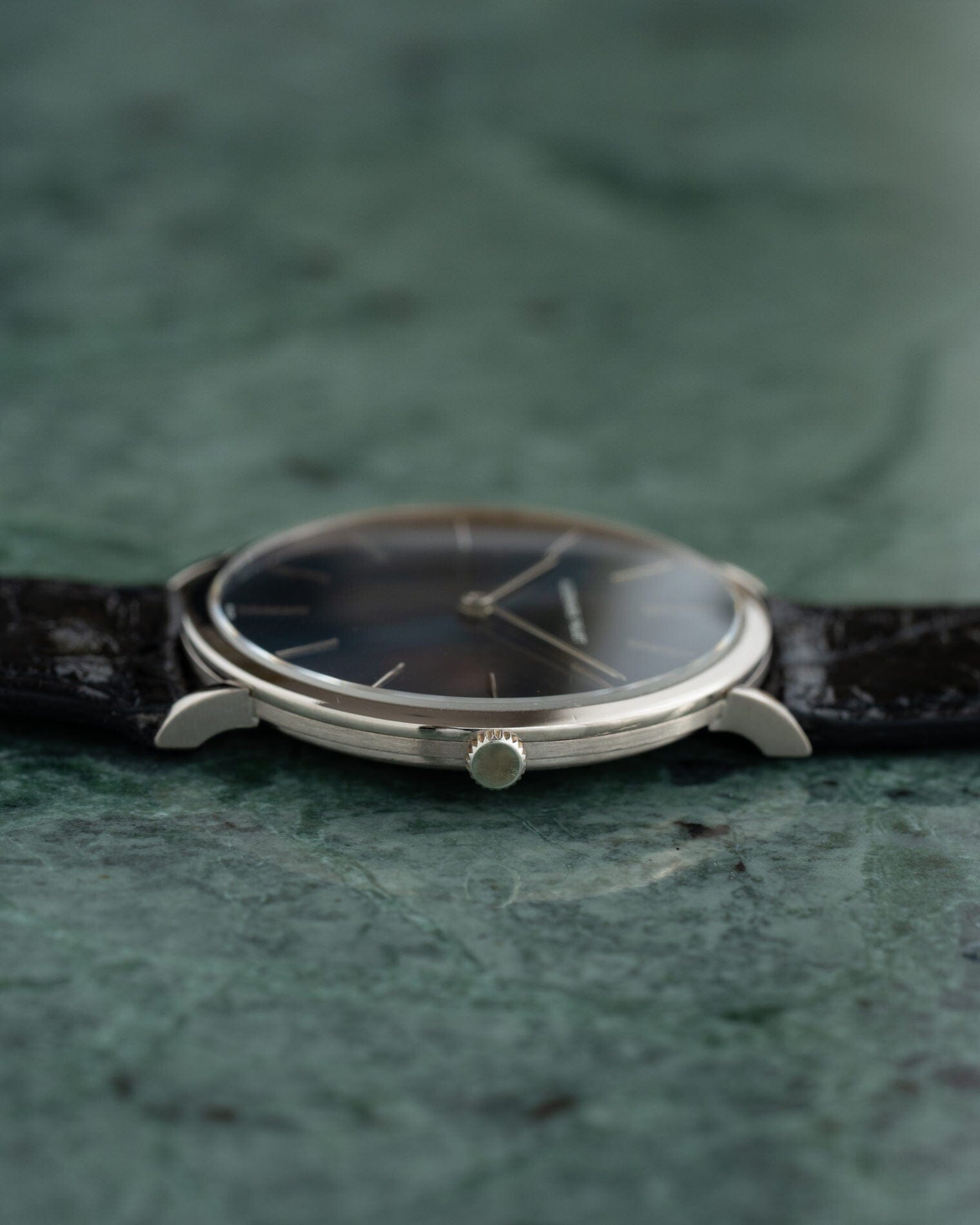 This watch is a hand-wound round watch made in the 1970s. An extremely thin case made of 18K white gold, sometimes referred to as extra flat. It features a flat bezel and curved lugs when viewed from the side.