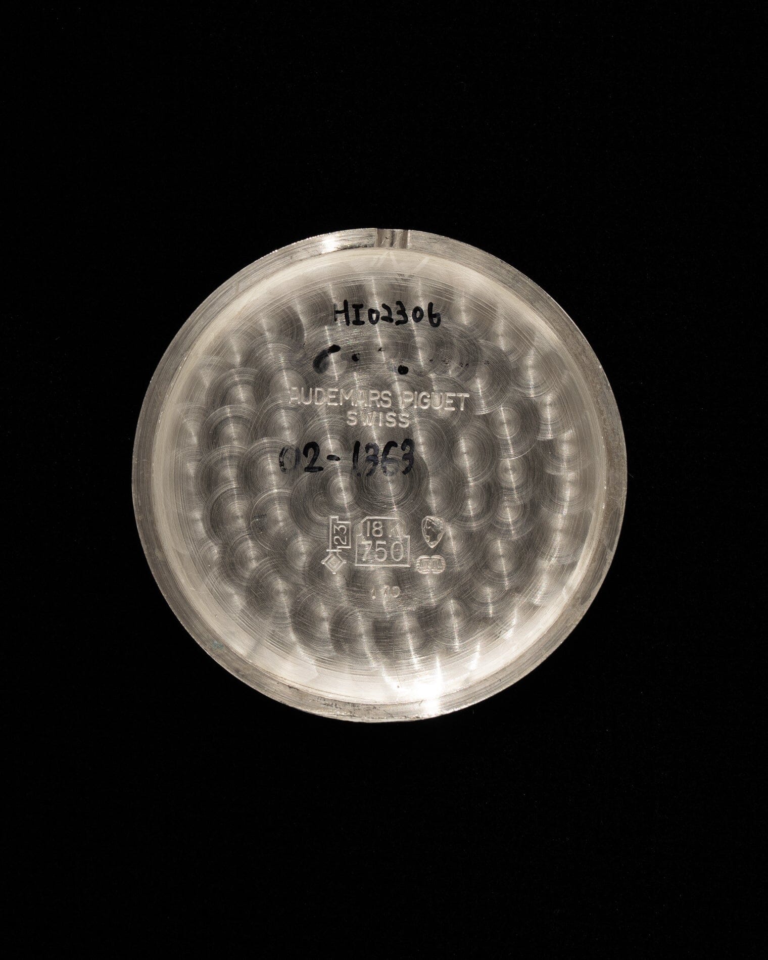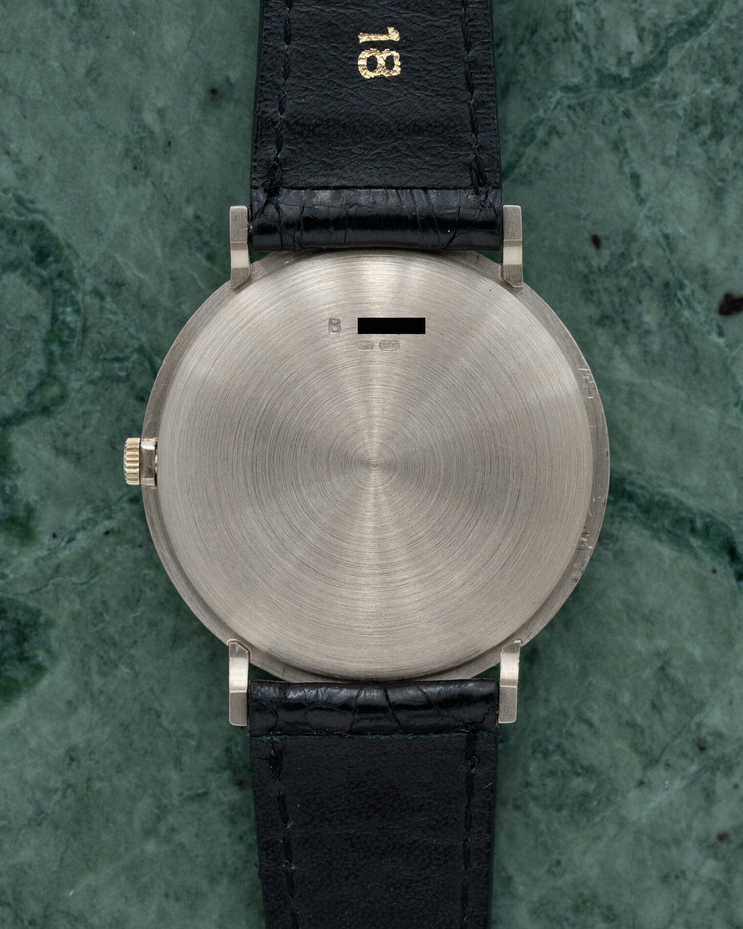 The bezel is polished, but the sides have a hairline finish. The case back has a concentric satin finish and is engraved with an 18K gold hallmark and serial number.