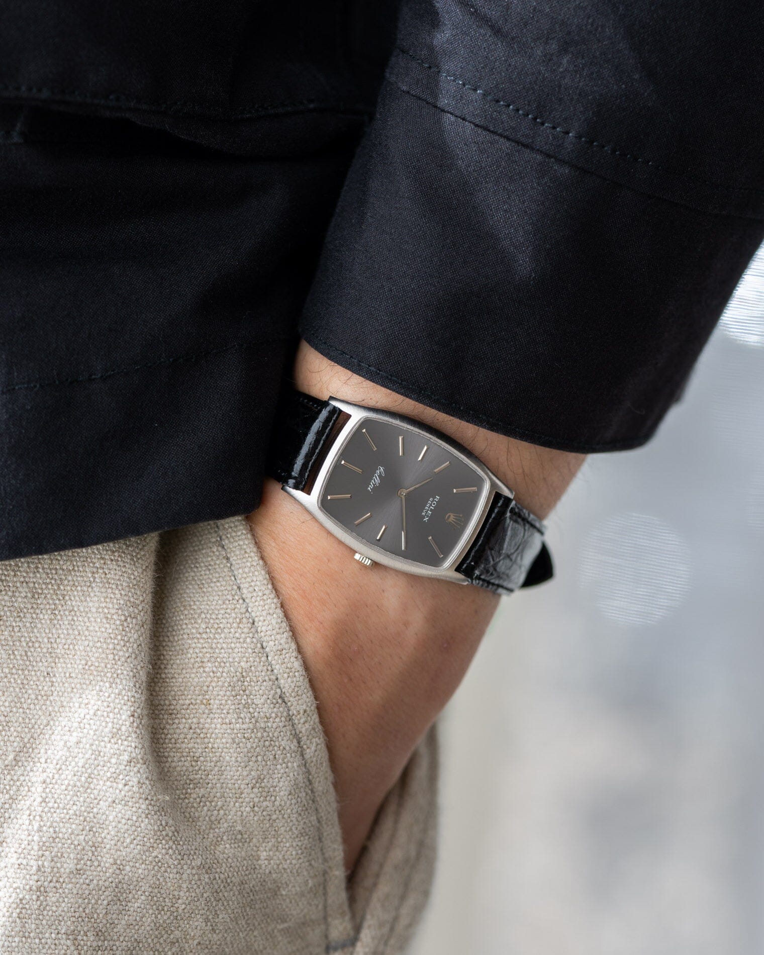 This reference 3807 is a rare tonneau type shape watch, and has an integrated design including the lugs. The case material is 18K white gold.
