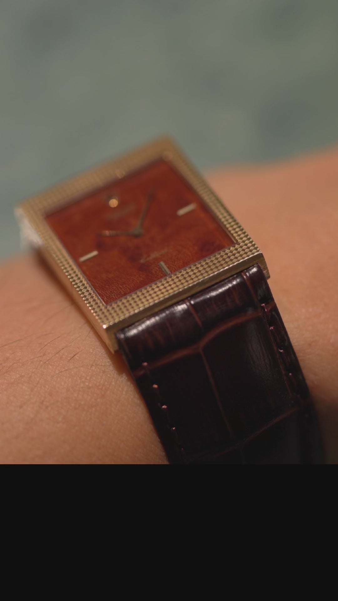Reference 4127 is a dress watch with a rectangular case and a burl wood dial, manufactured around 1990.